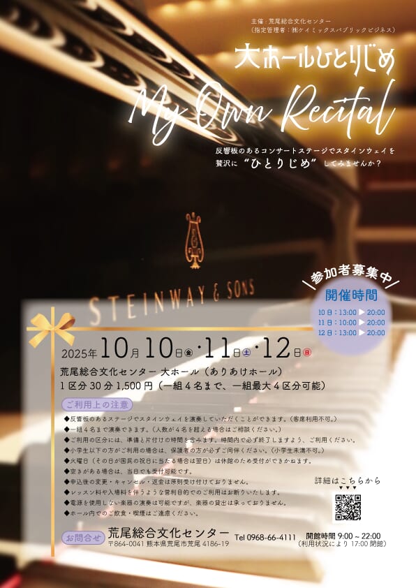 ♦荒尾総合文化センター事務所では9月20日(土)10:00より、申込フォームでは9月20日(土)13:00より受付を開始いたします。受付は先着順でございます。