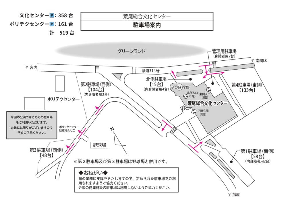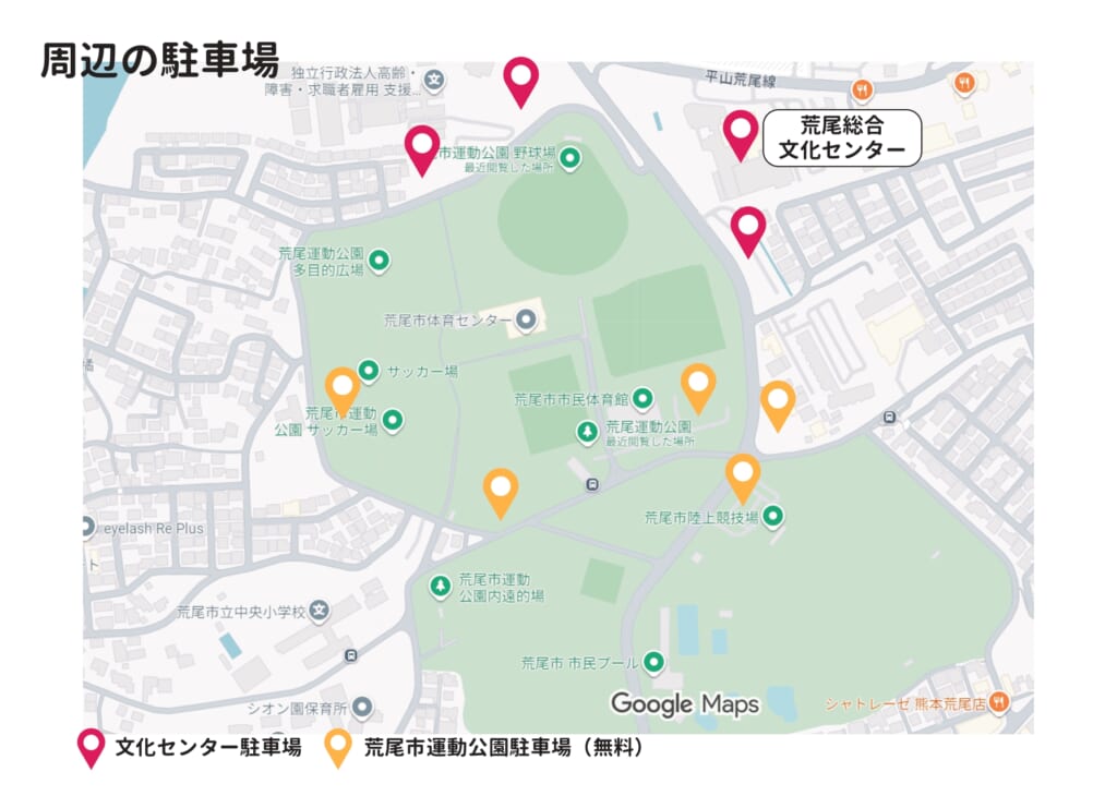 当館の駐車場(無料・358台)とあわせまして、ポリテクセンター駐車場(無料・161台・ 15:00~20:00 )、荒尾市運動公園駐車場(無料)をご利用ください。