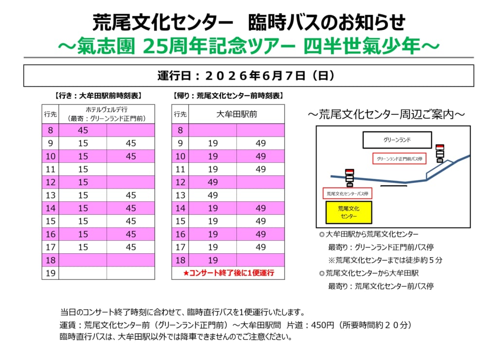 6月7日(日)開催『氣志團現象25周年記念ツアー「四半世氣少年」』につきまして、西鉄バス大牟田様にご協力いただき、終演後の臨時バスの運行が決定いたしました。